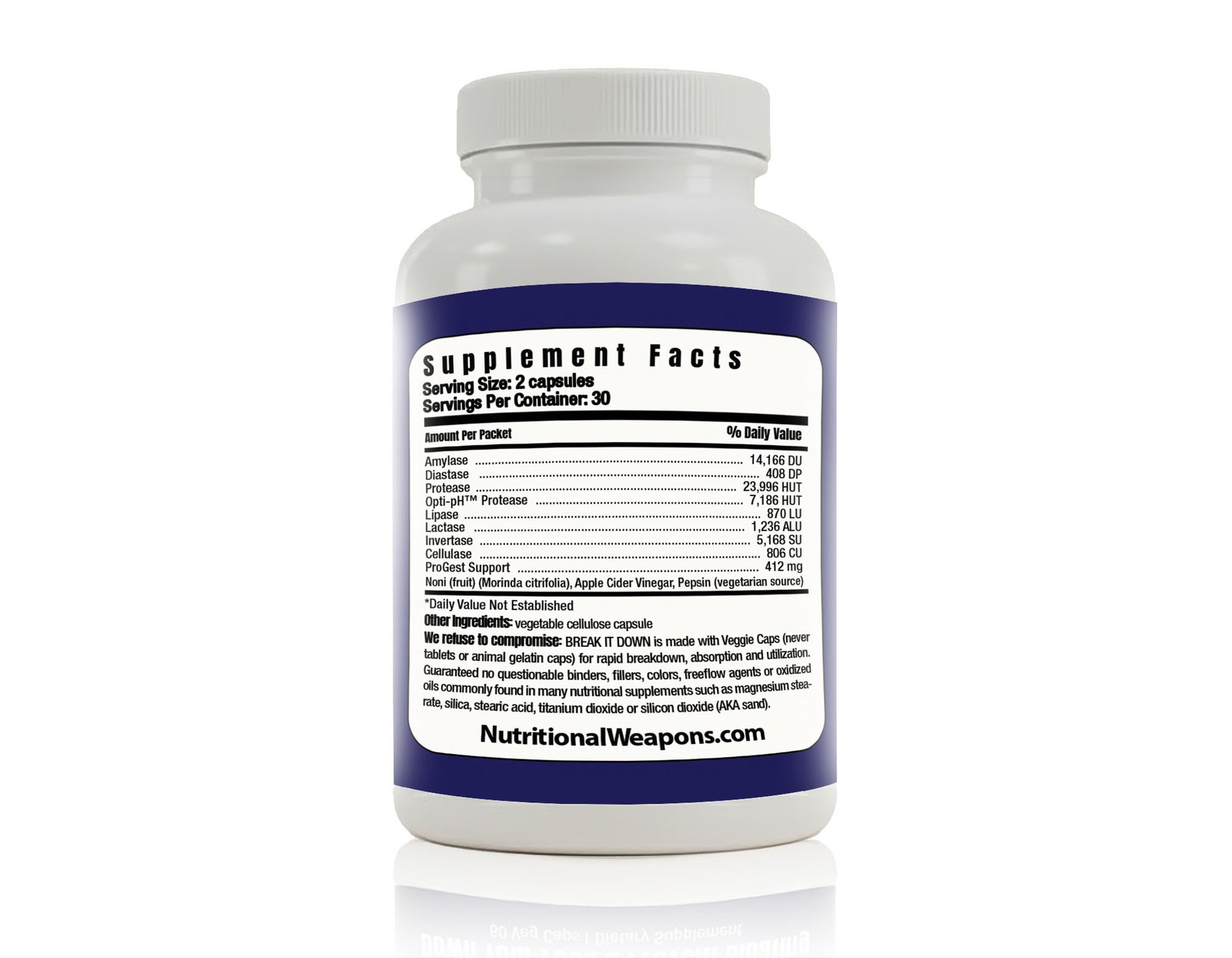 Break it Down is an advanced digestive enzyme formula that delivers the most potent and pure source of vegetarian enzymes to support the digestion of proteins, carbohydrates, fats, fiber, and dairy.