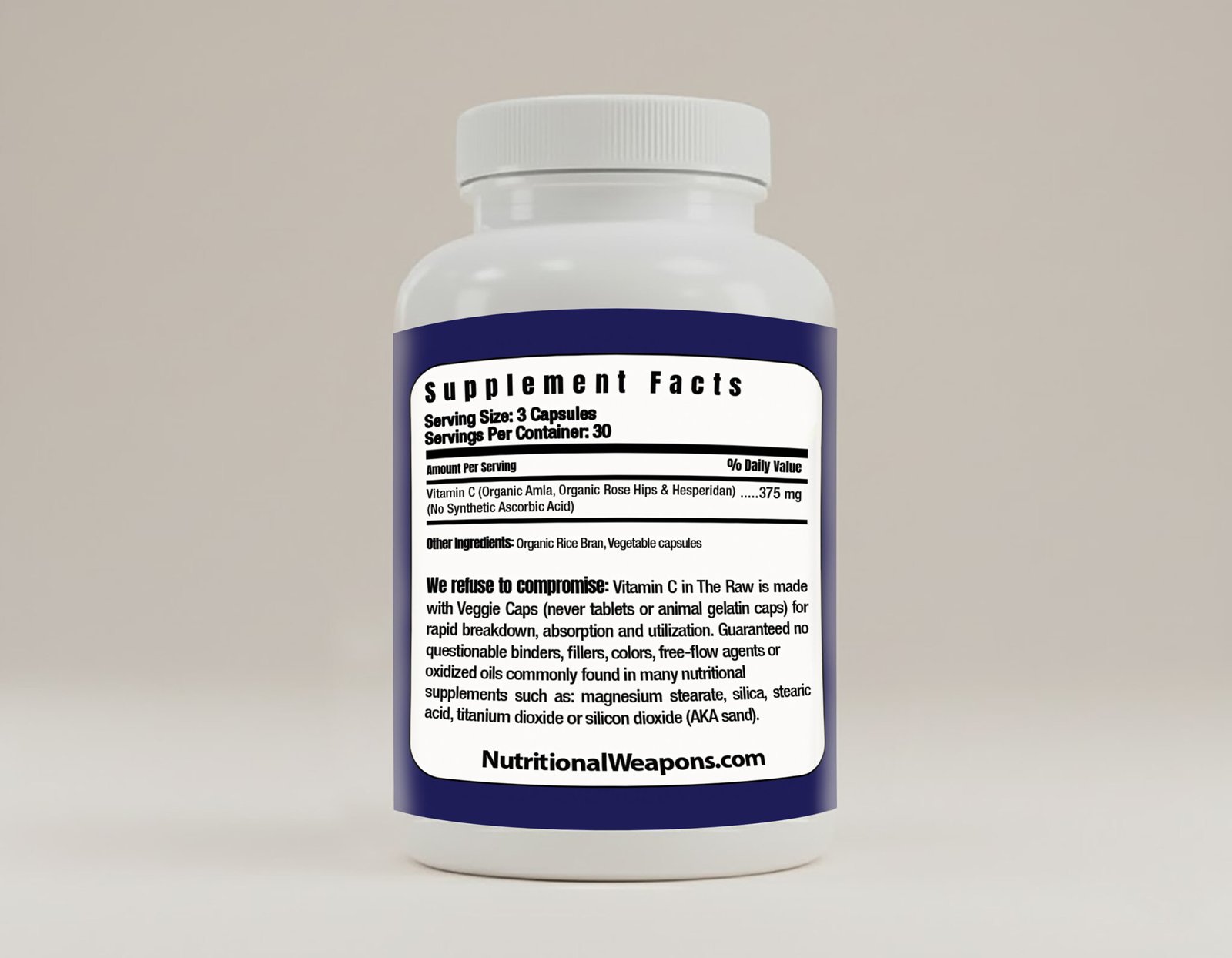 We refuse to compromise: Vitamin C in The Raw is made with Veggie Caps (never tablets or animal gelatin caps) for rapid breakdown, absorption and utilization. Guaranteed no questionable binders, fillers, colors, free-flow agents or oxidized oils commonly found in many nutritional supplements such as: magnesium stearate, silica, stearic acid, titanium dioxide or silicon dioxide (AKA sand).