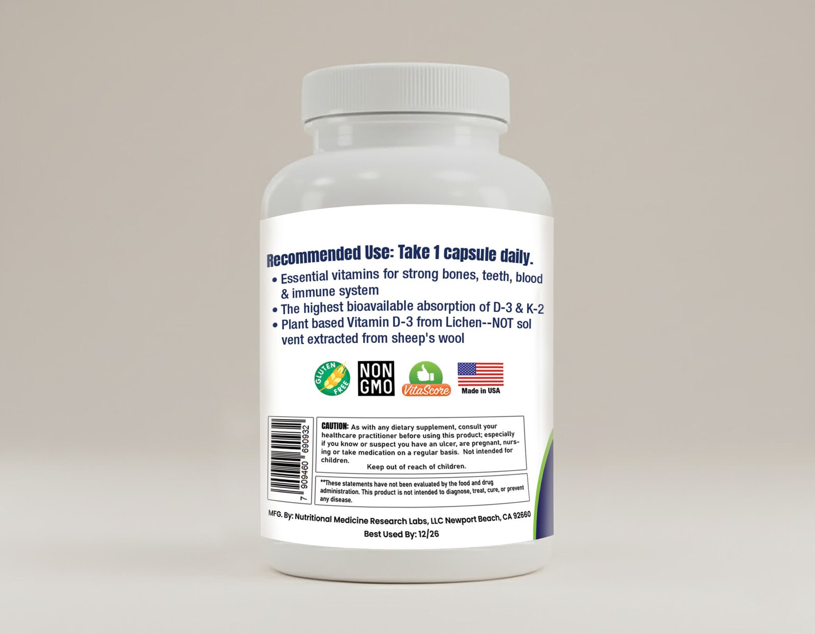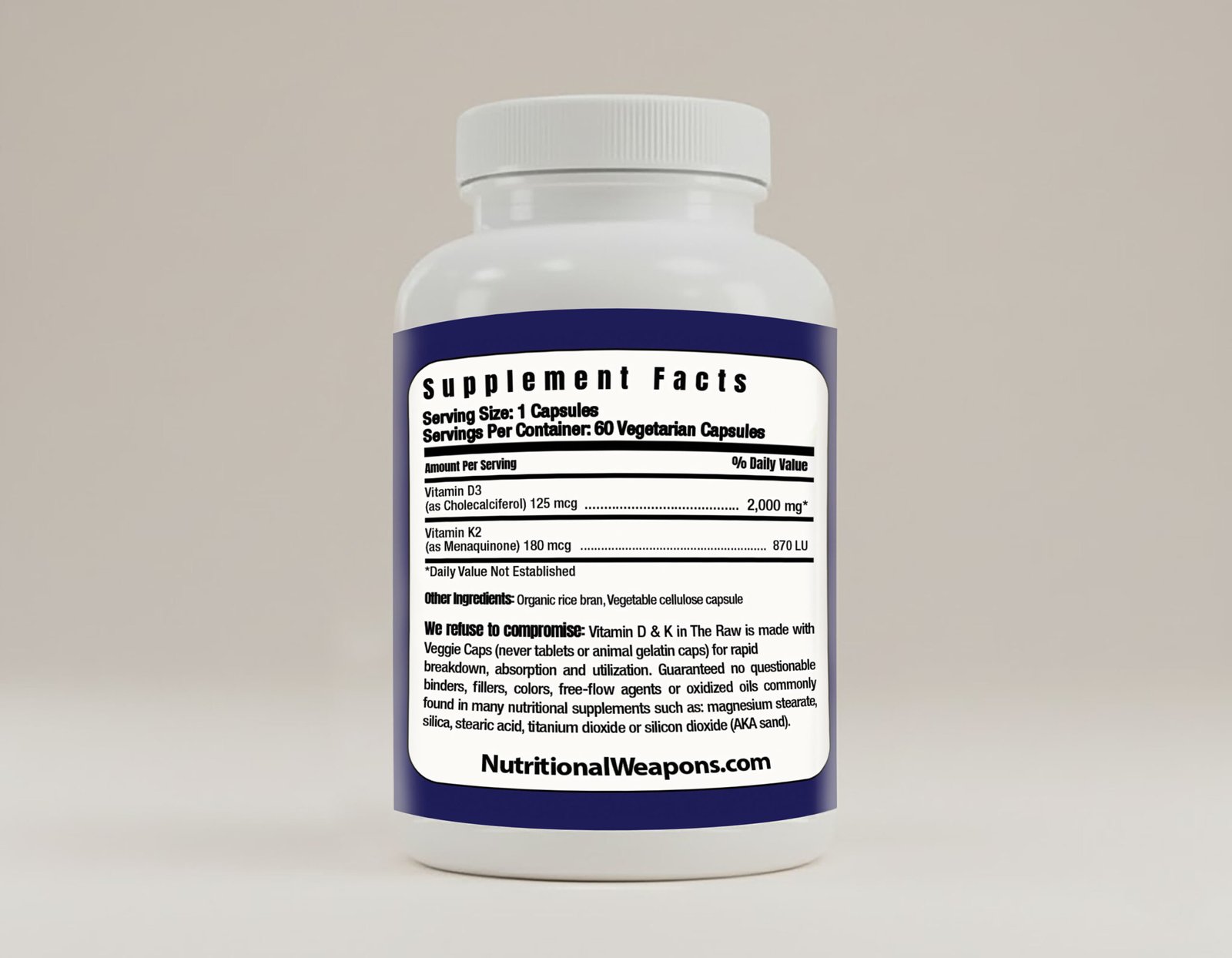 Each capsule provides 5,000 IU (125 mcg) of vitamin D3 and 180 mcg of vitamin K2 derived from fermented natto, one of the most bioavailable forms of K2 available. *